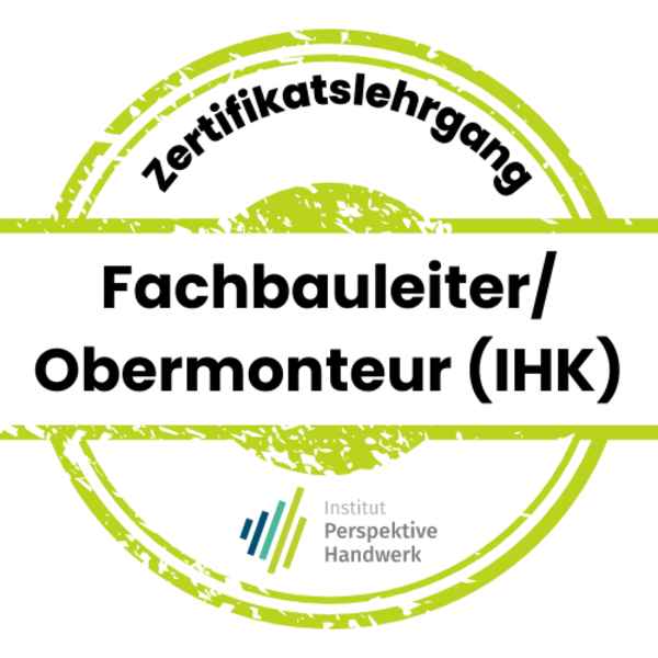 Der Zertifikatslehrgang Fachbauleiter und Obermonteur wird vom Institut Perspektive Handwerk in Zusammenarbeit mit der Industrie- und Handelskammer angeboten. Der Lehrgang umfass 5 Präsenztage plus einer Online Begleitung und schließt bei der Industrie- und Handelskammer mit einem Leistungsnachweis ab.